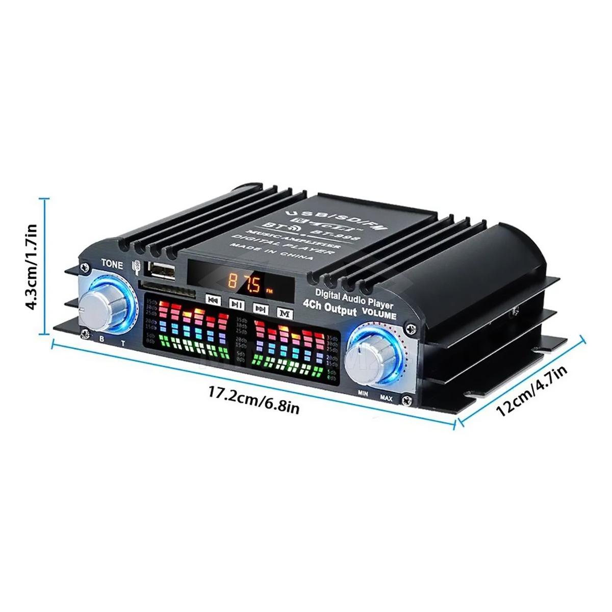 Корпус усилителя изготовлен из прочного металла. Компактные размеры 17.2х12х4.3 см позволяют легко разместить его в любом удобном месте. Питание осуществляется от адаптера 12В/2-5А (не входит в комплект).